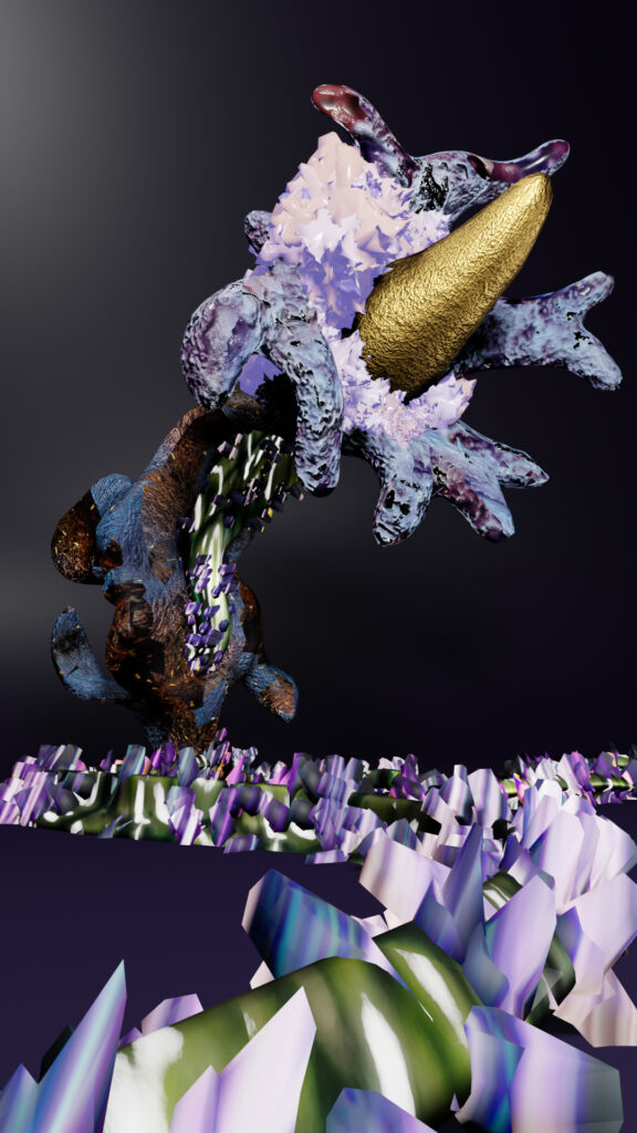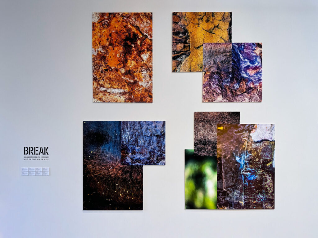 BREAK consists of 4 digital photo collages printed on matte archival inkjet paper and mounted, as well as an augmented reality experience that permeates throughout the entire gallery space. The photos are arranged on the wall in such a way as to represent a map of the overall gallery space. With each photo representing its corresponding digital sculpture in the gallery. The digital sculptures in turn utilize the photographs as their textures for the “hand” sculpted 3d models made in Blender.